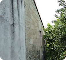 Piquetage de la façade pour l’assainir complètement. Puis dégrossi de la façade et enfin enduit avec le groupe Vega, et des fausses pierres de tailles dans les angles.