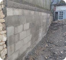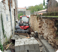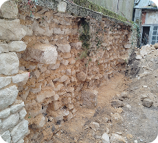 Montage d’un mur en agglos pour réparer un mur en pierres écroulées.